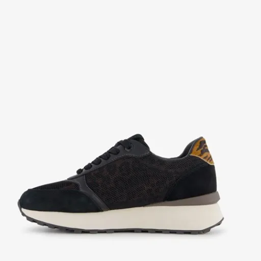 Zwarte Hush Puppies dames sneakers. Gemaakt van leer, een binnenwerk van imitatieleer en een rubberen zool. De sneakers hebben een vetersluiting en comfortabel voetbed van imitatieleer. Deze is uitneembaar. Voorzien van bronskleurige accenten en luipaardprint op de hiel.