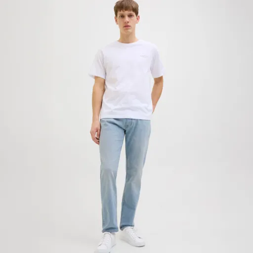 Lichtblauwe heren jeans van JJ REBEL in lengtemaat 32. Voorzien van een knoop- en ritssluiting, riemlusjes in de boord en twee voor- en achterzakken. De broek heeft een tapered fit pasvorm en een merklabel aan de achterzijde. Gemaakt van 70% katoen, 28% polyester en 2% elastaan.