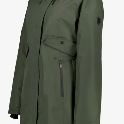 Lange, groene outdoor jas voor dames van Kjelvk. Voorzien van een ritssluiting met overlap, een vaste capuchon met aansnoerkoordjes en twee afsluitbare zakken. De outdoor jas is vervaardigd van ademend, winddicht en waterafstotend materiaal tot een waterkolom van 8.000 MM. De jas is verstelbaar d.m.v. de aantrekkoordjes en heeft een binnenzak. gemaakt van 100% polyester.