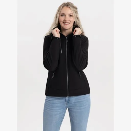 Zwarte softshell jas voor dames van Kjelvik. Voorzien van een ritssluiting met kinbeschermer, een afneembaar capuchon met aantrekkoordjes en drie zakken met ritsen aan de voorzijde. Deze damesjas is waterafstotend, winddicht en vervaardigd van ademend materiaal. Gemaakt van 94% polyester en 6% polyester.