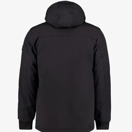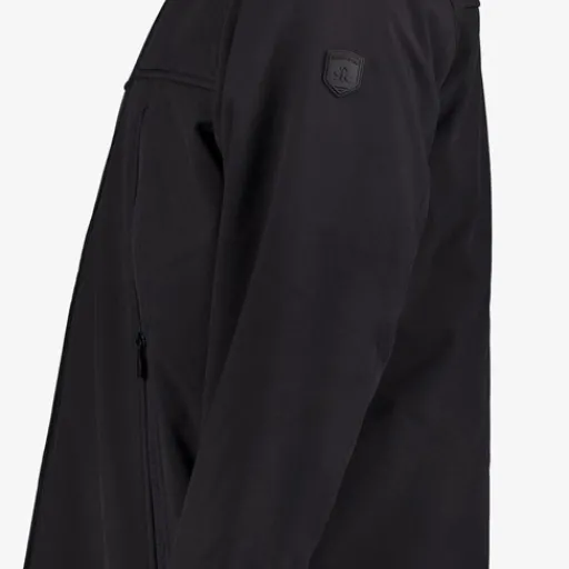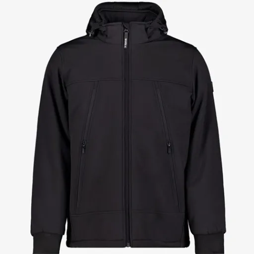Zwarte 3-laagse softshell jas voor heren van Kjelvik. Voorzien van een ritssluiting en een afneembare capuchon met aansnoerkoordjes. De softshell jas heeft twee zakken met ritsen en is ademend, waterafstotend en winddicht. Dankzij het gebruik van stretch heeft de jas een comfortabele pasvorm. Gemaakt van 94% polyester en 6% elastaan.