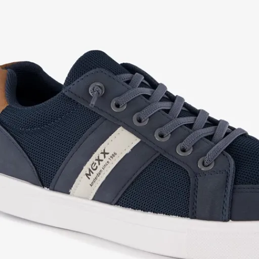 Blauwe heren sneakers van Mexx. Het buitenwerk is gemaakt van textiel en imitatieleer, het binnenwerk van textiel en stevige zool is van rubber. Voorzien van een vetersluiting en een comfortabele binnenzool van textiel. Deze is niet uitneembaar. De sneakers hebben een witte buitenzool, merkopdrukken aan de zijkanten en een bruine detail op de hak.