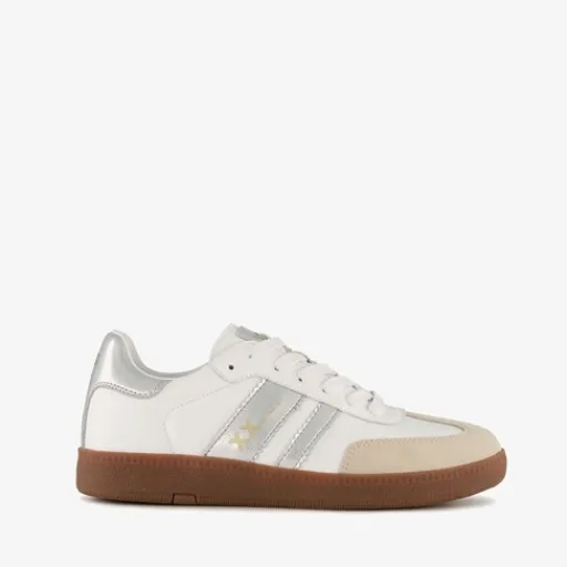 Lage, witte XX By Mexx sneakers voor dames. Gemaakt van imitatieleer, een binnenwerk van textiel en een rubberen zool. De sneakers hebbn een vetersluiting en comfortabel voetbed van imitatieleer. Deze is uitneembaar. Voorzien van zilverkleurige metallic details op het bovenwerk.