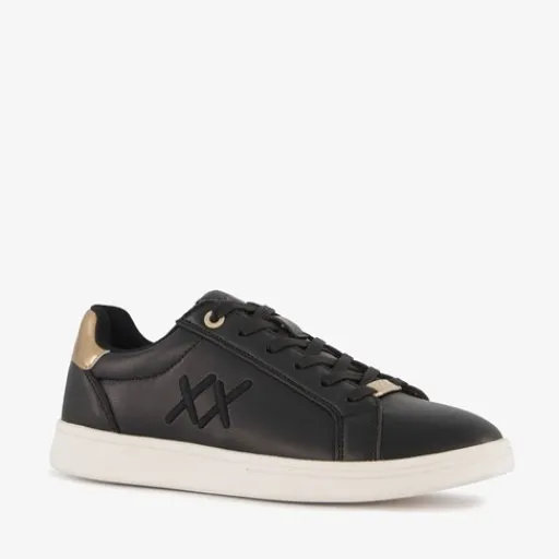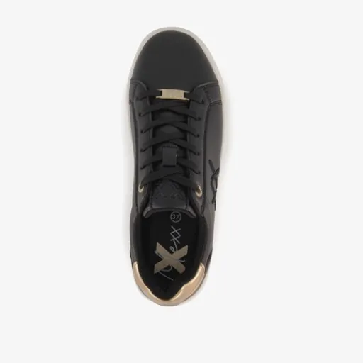 Zwarte XX By Mexx sneakers voor dames. Gemaakt van imitatieer, een binnenwerk van textiel en een rubberen zool. De sneakers hebben een vetersluiting en uitneembaar voetbed van textiel. Voorzien van een goudkleurig metallic accent op de hiel en merkopdrukken aan de zijkant.