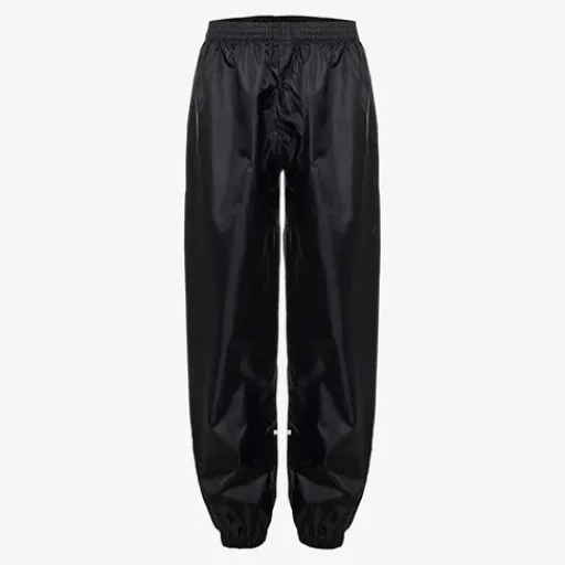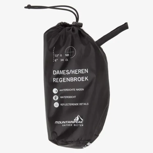 Zwarte regenbroek voor dames en heren uit de Mountain Peak collectie. Voorzien van een elastische tailleband en reflecterende accenten op de benen zodat je goed opvalt in het verkeer. De regenbroek is gemaakt van polyester en heeft een waterdichtheid van 2000mm.