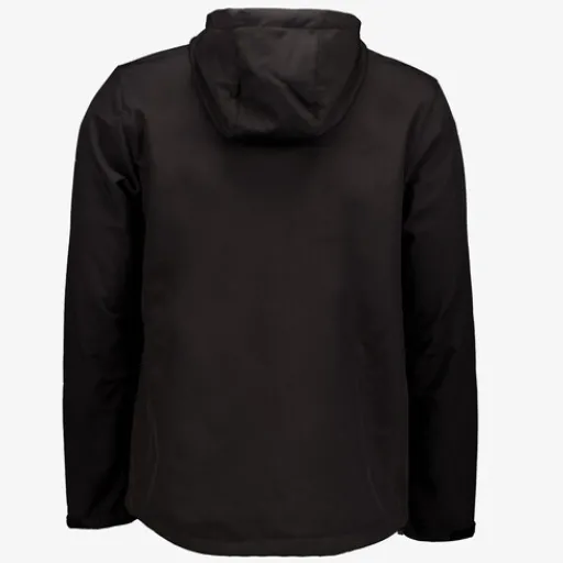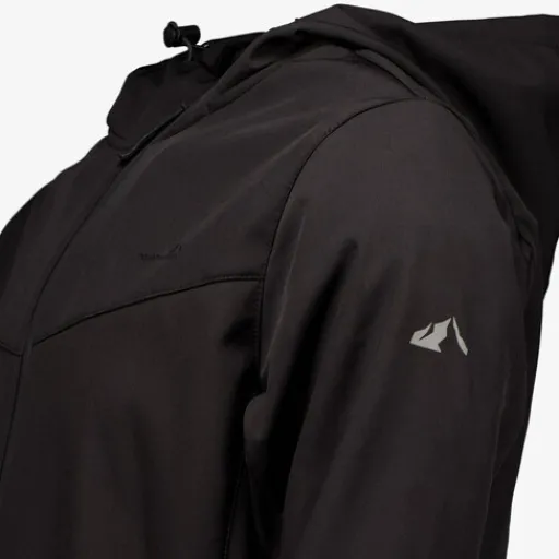 Zwarte softshell jas voor heren van Mountain Peak. Voorzien van een ritssluiting met kinbeschermer en een hoge kraag met aantrekkoordjes. De rits is voorzien van een windstopper. De jas heeft een vaste capuchon, twee steekzakken met ritssluiting en verstelbare boorden met klittenband. Vervaardigd van ademend, waterafstotend en winddicht materiaal. Dankzij de soft touch en stretch is de softshell jas comfortabel om te dragen. De jas heeft een waterkolom van 3000MM. Gemaakt van 95% polyester en 5% elastaan.