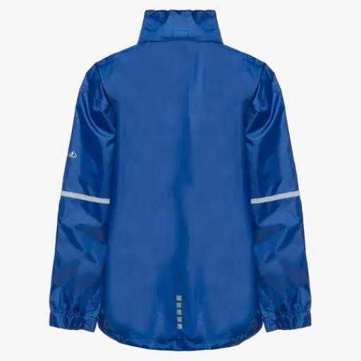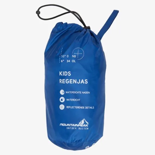 Blauwe regenjas voor kids van Mountain Peak. Voorzien van een ritssluiting met overlappende klittenbandsluitingen zodat wind en regen tegen gehouden worden. De regenjas heeft elastische boorden en is aan de onderzijde aan te snoeren. Voorzien van een oprolbare capuchon en een waterdichtheid tot 10.000 MM. De winddichte regenjas heeft een handig opbergzakje en op de armen zijn reflecterende accenten aangebracht zodat je goed opvalt in het verkeer. Gemaakt van polyester.