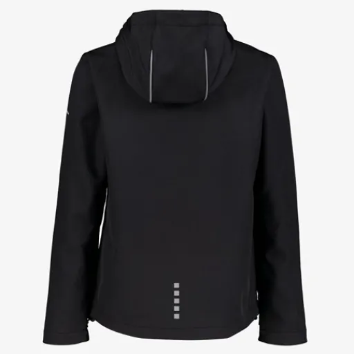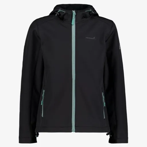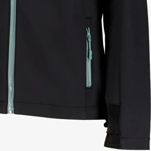 Zwarte softshell jas voor kids van Mountain Peak. Voorzien van een ritssluiting met windstoppers en een kinbeschermer, een vaste capuchon met aansnoerkoordjes en zakken met ritsen. De softshell jas heeft waterdichte ritsen en verstelbare boorden met klittenband. Vervaardigd van ademend, winddicht en warmte regulerend materiaal met een waterkolom van 8.000 MM. Gemaakt van 95% polyester en 5% elastaan.