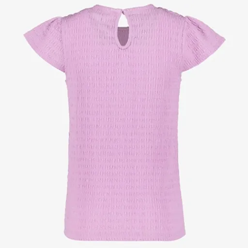 Lila T-shirt voor meisjes. Voorzien van korte mouwen, een ronde hals en knoopsluiting in de nek. Het shirt heeft borduursels op de schouders. Gemaakt van 98% polyester en 2% elastaan.