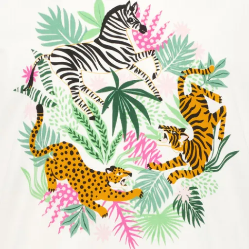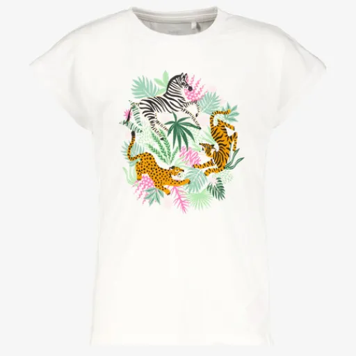 Wit meisjes T-shirt van Name it. Voorzien van een ronde hals en korte mouwen. Het shirt heeft een kleurrijke opdruk van jungle dieren aan de voorzijde. Gemaakt van 100% katoen.