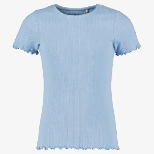 Lichtblauw T-shirt voor meisjes van Name It. Voorzien van korte mouwen en een hoge, ronde hals. Het shirt heeft structuur in de stof en ruches bij de boorden. Gemaakt van 100% katoen.