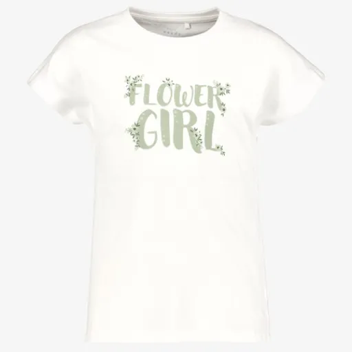 Wit meisjes T-shirt van Name it. Voorzien van een ronde hals en korte mouwen. Het shirt heeft een groene tekstopdruk aan de voorzijde. Gemaakt van 100% katoen.