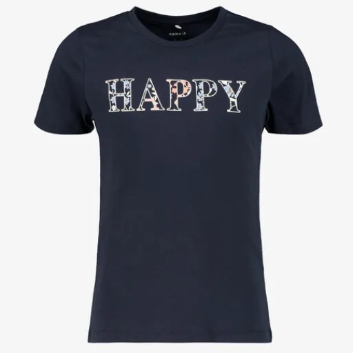 Donkerblauw Name It Vinaya T-shirt voor meisjes. Voorzien van korte mouwen, een ronde hals en een tekstopdruk aan de voorzijde. Het shirt heeft een aansluitende pasvorm en is gemaakt van 100% katoen.
