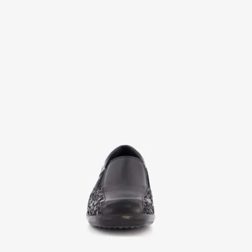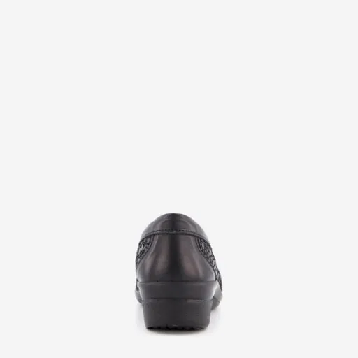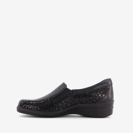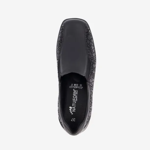 Zwarte instappers voor dames van Natuform. Gemaakt van leer met een binnenwerk van leer en een stevige profielzool van rubber. Voorzien van een elastische inzet en een comfortabel voetbed van leer. Deze is uitneembaar zodat je jouw eigen zolen in de schoenen kan dragen. De instappers hebben een slagenprint op het bovenwerk en een wijde pasvorm.