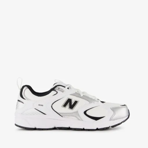 Wit-zwarte New Balance 408 sneakers voor dames. Het buitenwerk is gemaakt van textiel en imitatieleer, het binnenwerk van textiel en de stevige zool met profiel is van rubber. Voorzien van een vetersluiting en een comfortabele binnenzool van textiel. Deze is uitneembaar. De sneakers hebben zilverkleurige accenten en een wit-zwarte buitenzool.