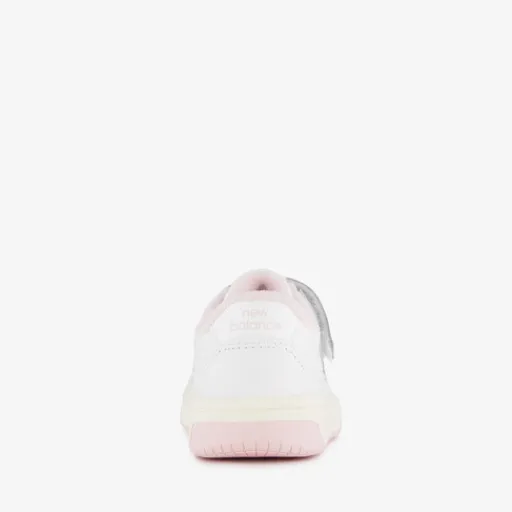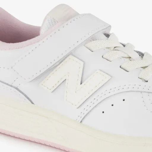 Witte New Balance sneakers voor meisjes. Het buitenwerk is gemaakt van imitatieleer, het binnenwerk van textiel en de stevige profielzool is van rubber. Voorzien van elastische veters en een klittenbandsluiting voor een optimale pasvorm en een comfortabele binnenzool van textiel. Deze is uitneembaar. De sneakers hebben perforatiegaatjes op het bovenwerk die voor ventilatie zorgen en pastelkleurige accenten.