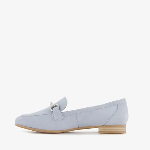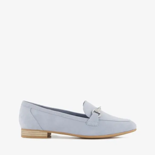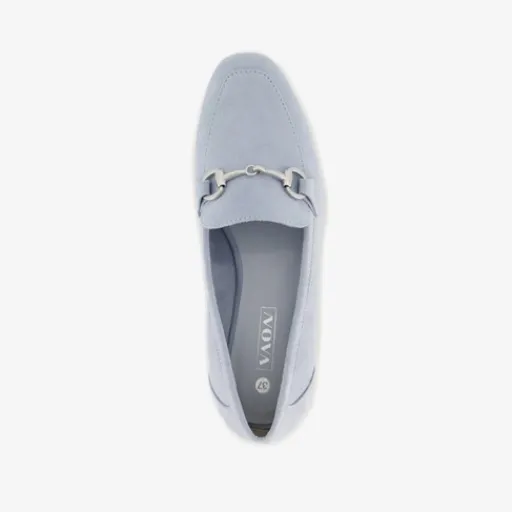 Lichtblauwe loafers voor dames van Nova. Gemaakt van imitatiesuede, een binnenwerk van imitatieleer en een rubberen zool. De loafers hebben een elastische instap en comfortabel Soft Foam voetbed. Voorzien van een zilverkleurige gesp op de neus.