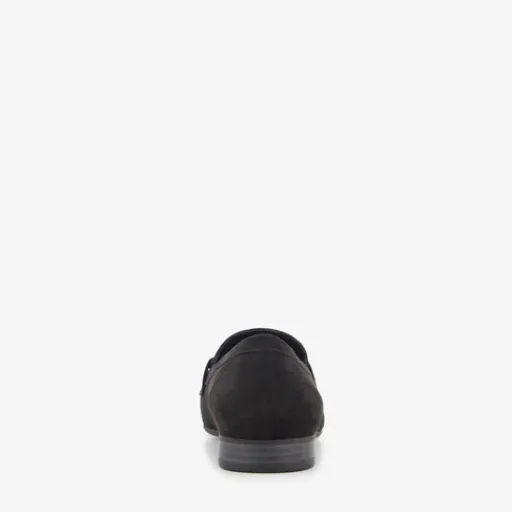 Zwarte loafers voor dames van Nova. Gemaakt van imitatiesuède met een binnenwerk van imitatieleer en een rubberen zool. De loafers hebben een elastische instap en gesp over de neus. Het vaste voetbed is gemaakt van synthetisch materiaal.