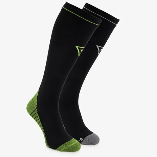 2 paar zwarte, lange compressiesokken van Osaga . De sokken stimuleren de bloedcirculatie door de compressie, helpen de zwelling van de voeten en benen te verminderen en zijn ideaal voor alle sporten. Gemaakt van 89% polyamide, 6% polyester 5% elastaan.