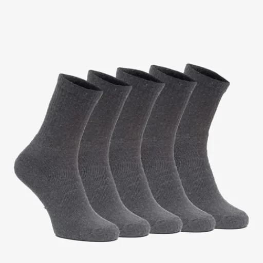 Vijf paar grijze sportsokken voor heren en dames van Osaga. De sportsokken zijn middellang van lengte en gemaakt van 65% katoen en 35% polyester.