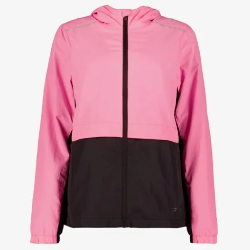 Roze hardloop jas voor dames van Osaga. Voorzien van een capuchon, een ritssluiting met kinbescherming en zakken met ritsen aan de voorzijde. De jas heeft reflecterende accenten op de schouders, zakken met ritsen aan de voorzijde en ventilatie openingen aan de voor- en achterzijde. Gemaakt van 100% nylon.