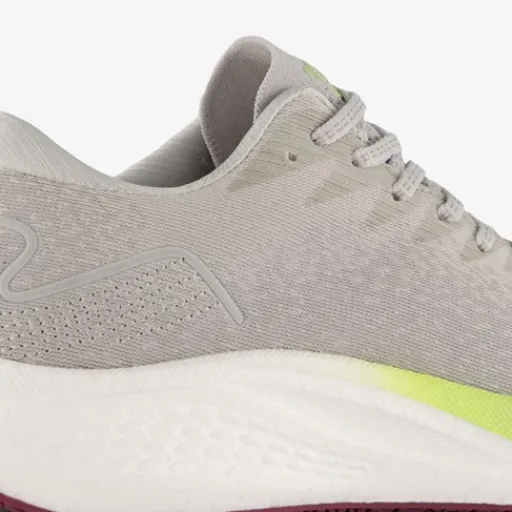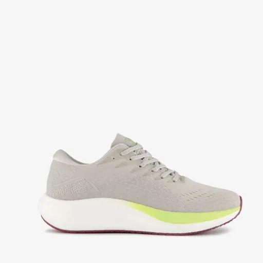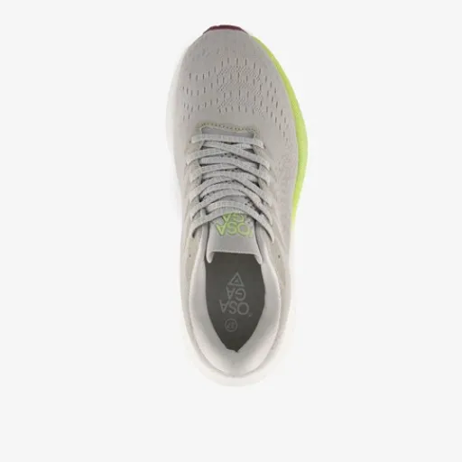 Grijze hardloopschoenen voor dames van Osaga. Het buitenwerk is gemaakt van textiel en mesh, het binnenwerk van textiel en de profielzool is van rubber. Voorzien van een vetersluiting en een uitneembare binnenzool met Soft Foam. Deze biedt demping en comfort. De dikke buitenzool is wit met een gele detail en een rode buitenzool.
