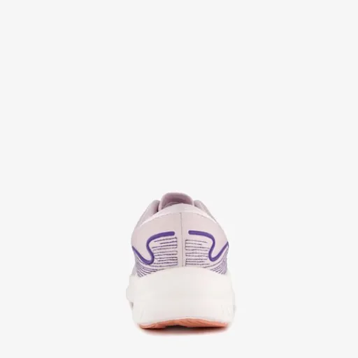 Lichtpaarse hardloopschoenen voor dames van Osaga. Het ademende buitenwerk is gemaakt van textiel en mesh, het binnenwerk van textiel en de antislip profielzool is van rubber. Voorzien van een vetersluiting en een comfortabele binnenzool van textiel. Deze is uitneembaar zodat je jouw eigen zolen in de schoenen kan dragen. De schoenen hebben een wit met oranje buitenzool en worden versierd met paarse details.