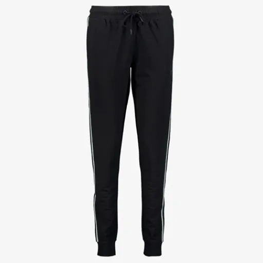 Zwarte joggingbroek voor dames van Osaga. Voorzien van een elastische tailleband met aantrekkoordjes en twee steekzakken aan de voorzijde. De broek heeft een blauw/witte strook langs de zijkanten en elastische boorden bij de enkels. Gemaakt van 95% katoen en 5% elastaan.