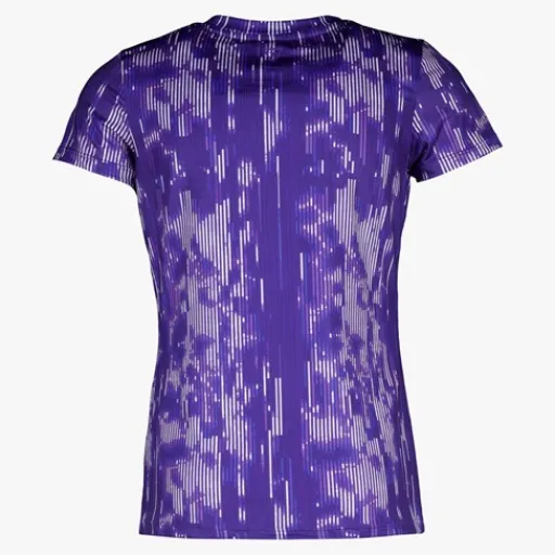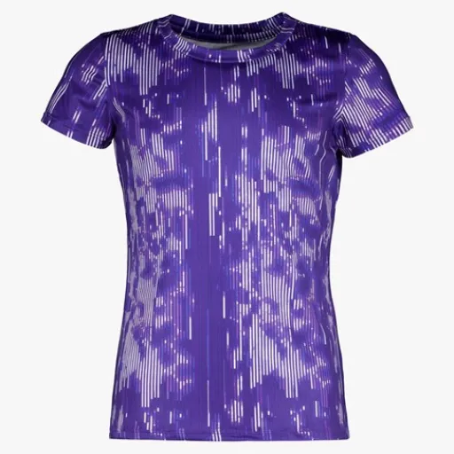 Paars sport T-shirt voor meiden. Voorzien van korte mouwen en een hoge, ronde hals. Het shirt heeft een grafische all over print. Gemaakt van 87% gerecycled polyester en 13% elastaan. Dankzij het zweetafvoerende en vochtregulerend materiaal blijf je langer droog tijdens het sporten. Het zweet wordt namelijk snel geabsorbeerd en verdampt. Zo blijf je niet alleen droog en comfortabel maar verspil je ook minder energie aan het afkoelen en opwarmen van je lichaam.