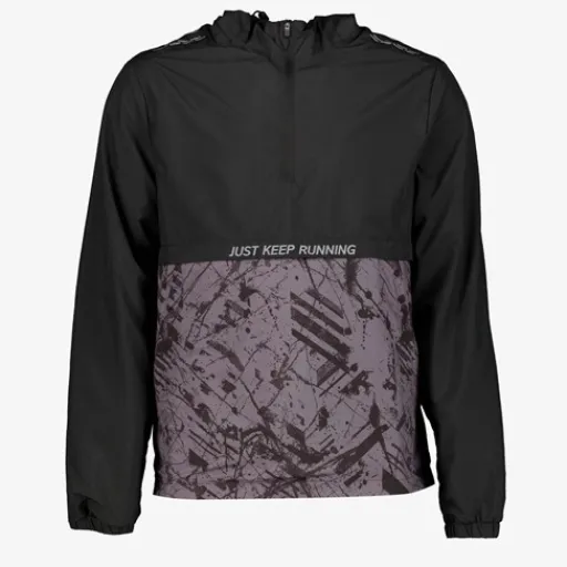 Zwarte hardloop anorak voor heren van Osaga. Voorzien van een capuchon met aantrekkoordjes, een korte ritssluiting en twee steekzakken aan de voorzijde. De onderkant van deze mooie sportjas is paars van kleur en heeft een grafisch printje. Daarnaast is de anorak voorzien van reflecterende accenten op de schouder en de rug zodat je goed opvalt in het donker. Gemaakt van polyester.