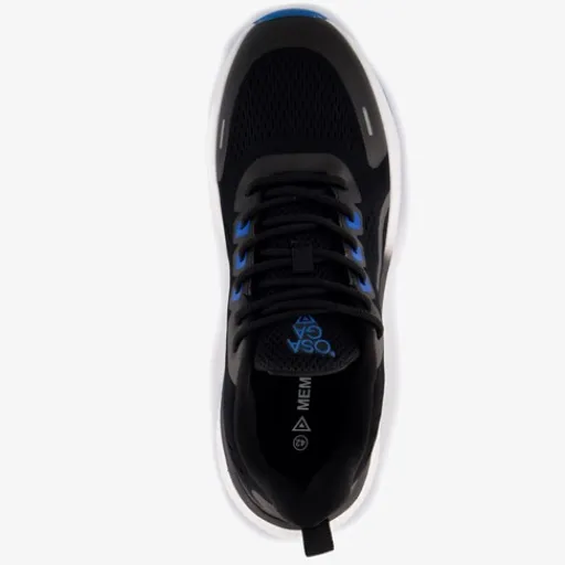 Zwarte Osaga hardloopschoenen voor heren. Het buitenwerk is gemaakt van mesh en imitatieleer, het binnenwerk van textiel en een profielzool van rubber. Voorzien van een vetersluiting voor een fijne pasvorm en hiellusjes voor een makkelijke instap. De sportschoenen wordt versierd met blauwe accenten en hebben een contrasterende witte buitenzool. Het uitneembare voetbed bevat Memory Foam wat demping en extra comfort biedt.