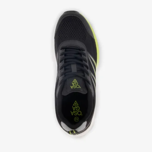 Zwart-gele hardloopschoenen voor heren van Osaga. Het boven- en binnenwerk zijn van textiel gemaakt en de stevige zool met profiel is ven rubber. voorzien van een vetersluiting, hiellusjes en een uitneembare binnenzool van textiel. De hardloopschoenen hebben een dikke buitenzool die schokken goed absorbeert en voor demping zorgt.