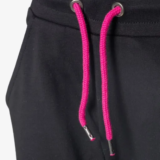 Zwarte joggingbroek voor kinderen uit de Osaga collectie. Voorzien van een elastische tailleband met roze aantrekkoordjes en twee steekzakken. De joggingbroek heeft elastiek in de broekspijpen en is gemaakt van 75% polyester en 25% katoen.ΒΆ