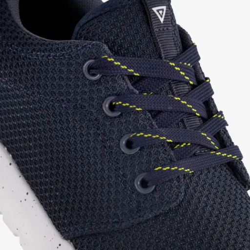 Blauwe sportschoenen voor kinderen van Osaga. Het buiten- en binnenwerk zijn gemaakt van textiel en de profielzool is van rubber. Voorzien van een vetersluiting, hiellusjes en een comfortabele binnenzool van textiel. Deze is uitneembaar zodat je eventueel je eigen zolen in de schoenen kan dragen. De schoenen hebben gele details en een witte buitenzool met blauwe spetters.