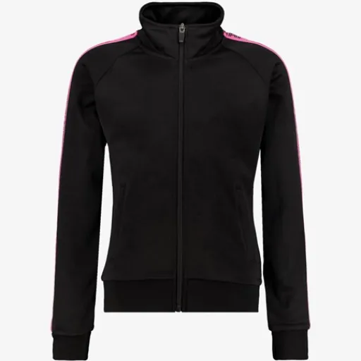 Zwarte trainingsjas voor meisjes van Osaga. Voorzien van een hoge kraag, een ritssluiting en twee steekzakken. De trainingsjas heeft roze accenten op de armen met tekst opdruk en elastiek in de boorden. Gemaakt van 80% polyester en 20% katoen.
