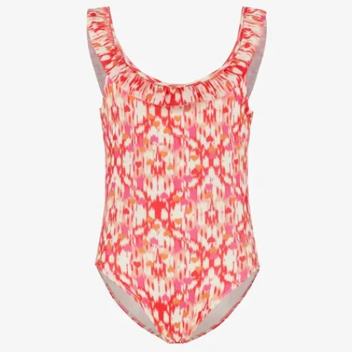 Roze badpak met een vrolijke print voor meisjes. Voorzien van ruches aan de bovenkant en over de schouderbanden. Gemaakt van 83% polyester en 17% elastaan.