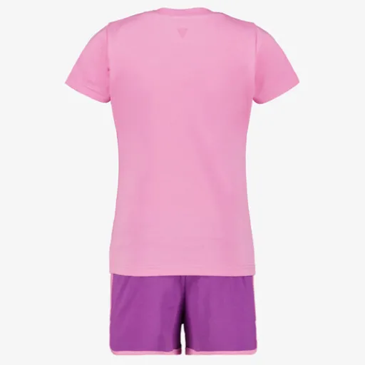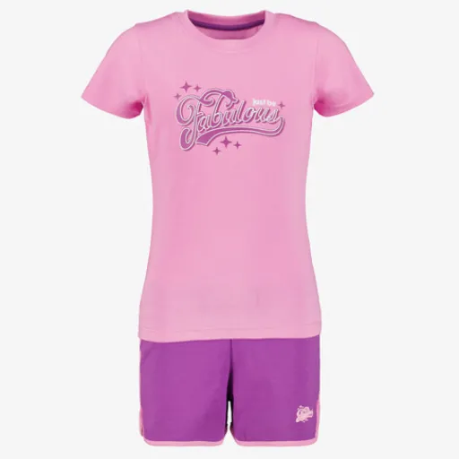 Dit paars-roze sport setje voor meisjes is ideaal voor gym of fitness. De set bestaat uit een roze T-shirt met een leuke tekstopdruk aan de voorzijde, een ronde hals en korte mouwen. De paarse short heeft aantrekkoordjes en een tekstopdruk op de bovenbeen. Dit Osaga sport setje voor meisjes is gemaakt van 95% katoen en 5% elastaan.