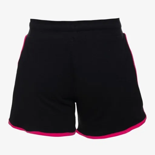 Zwart sweat short van Osaga, met roze details. Het broekje heeft een elastische tailleband met aantrekkoordjes en twee steekzakken aan de zijkanten. Gemaakt van 95% katoen en 5% elasthan.