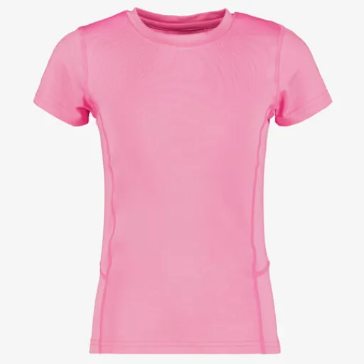 Roze sport T-shirt voor meisjes van Osaga. Voorzien van een ronde hals en korte mouwen. Gemaakt van 87% polyester en 13% elastaan.