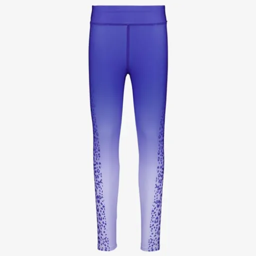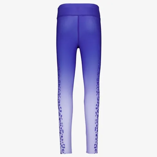 Paarse sportlegging voor meisjes. Voorzien van een elastische tailleband en aansluitende pasvorm. De sportlegging is vervaardigd van sneldrogend materiaal en bevat stretch voor voldoende bewegingsvrijheid. Op de zijkanten van de benen is luipaardprint aangebracht. De sportlegging is gemaakt van 79% polyester en 21% elastaan.