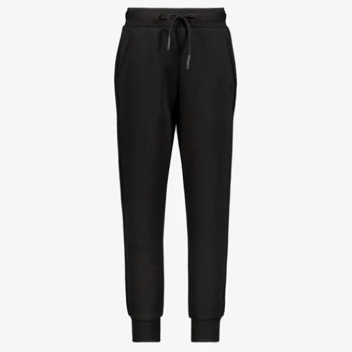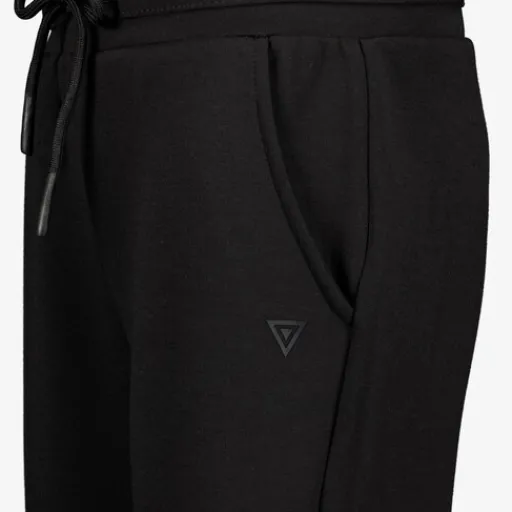 Zwarte trainingsbroek voor kinderen van Osaga. Voorzien van een elastische tailleband met aantrekkoordjes, twee steekzakken aan de voorzijde en een achterzakje. De broek heeft elastische broekspijpen en is gemaakt van 72% polyester, 23% viscose en 5% elastaan.