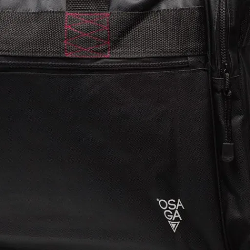 Zwarte sporttas van Osaga. Voorzien van verstelbare en afneembare schouderbanden en twee draaggrepen die aangesloten kunnen worden met klittenband. De sporttas heeft een afsluitbaar voorvakje en groot hoofdvak met ritssluiting en stevige bodem. Gemaakt van nylon met een totale inhoud van 74.6 liter. Afmetingen: 70 x 31 x 37 cm.