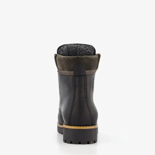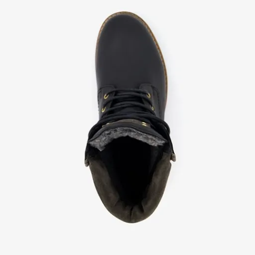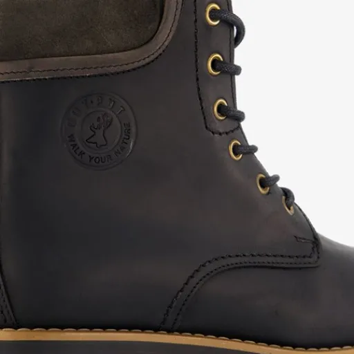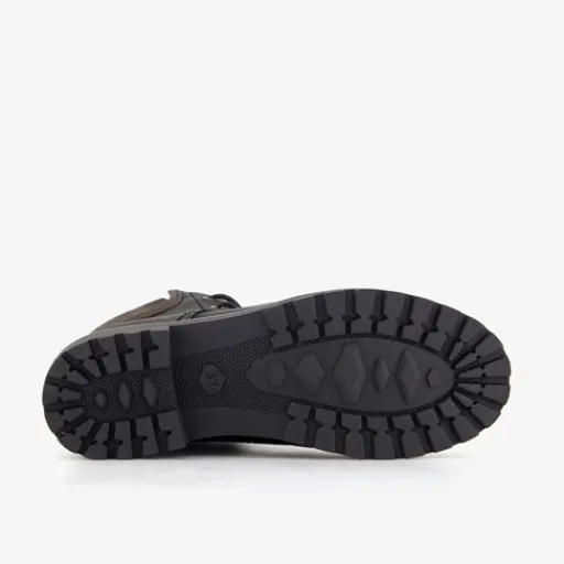 Zwarte veterboots voor dames uit de Output collectie. Het buiten- en binnenwerk zijn gemaakt van leer en de stevige profielzool is van rubber. Voorzien van een vetersluiting en een comfortabele voetbed van textiel. Deze stoere boots hebben een laag hakje van circa 2 cm en een schachthoogte van 14 cm. Binnenzool is niet uitneembaar.