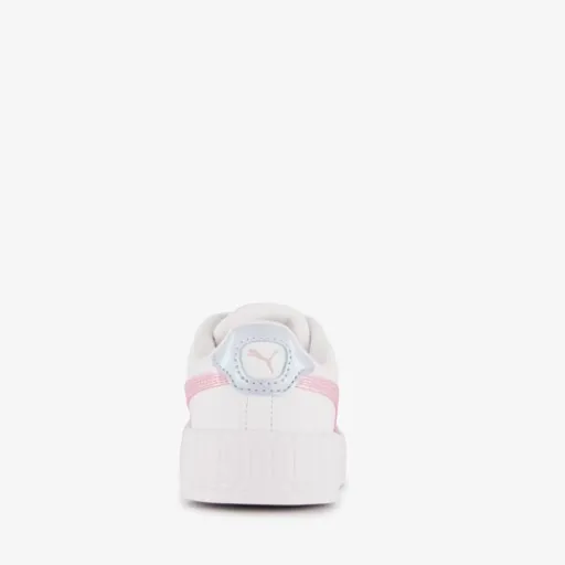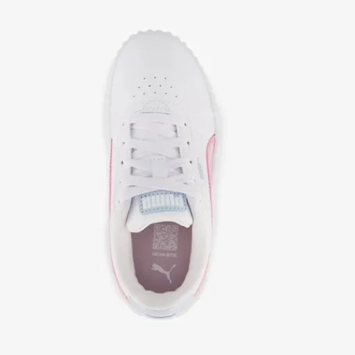 Witte Puma Carina 3.0 Blurry Dreams sneakers voor meisjes. Gemaakt van imitatieleer, een binnenwerk van textiel en een rubberen zool. De sneakers hebben een vetersluiting en vast SoftFoam voetbed van textiel.