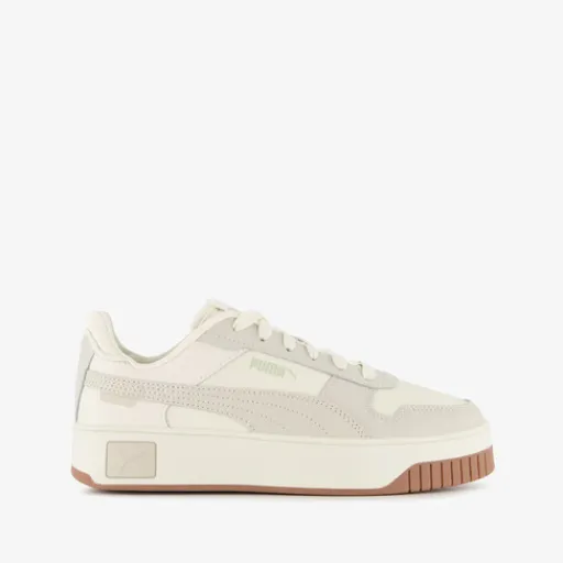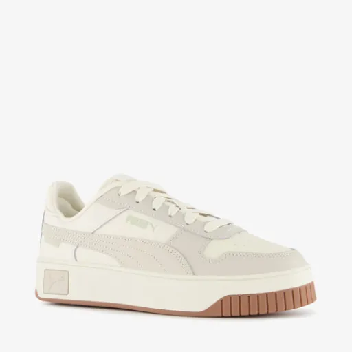 Beige Puma Carina Street sneakers voor dames. Het buitenwerk is gemaakt van imitatieleer, het binnenwerk van textiel en de stevige zool met profiel is van rubber. Voorzien van een vetersluiting en een comfortabele binnenzool van textiel. Deze is uitneembaar. De sneakers hebben een beige-bruine plateauzaal en op het bovenwerk zijn logo merkopdrukken aangebracht.