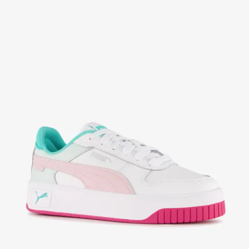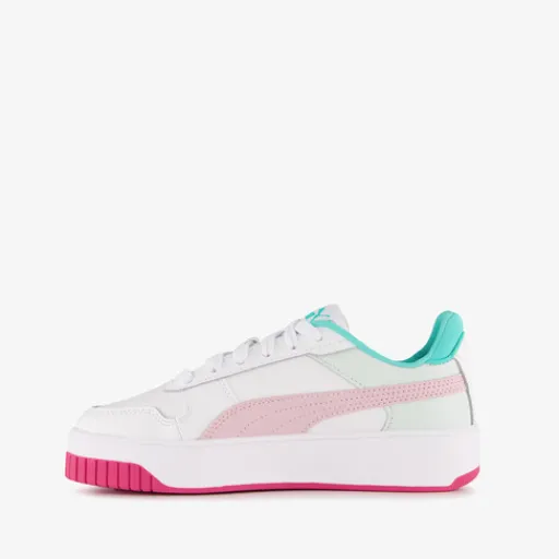 Witte Puma Carina Street sneakers voor meisjes. Het buitenwerk is gemaakt van imitatieleer, het binnenwerk van textiel en de plateauzool met profiel is van rubber. Voorzien van een vetersluiting en comfortabele binnenzool van textiel. Deze is uitneembaar zodat je eventueel je eigen zolen in de schoenen kan dragen. De Puma Carina Street sneakers hebben roze en groene details.