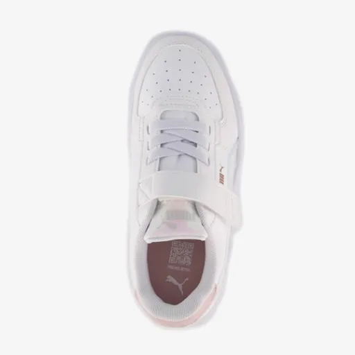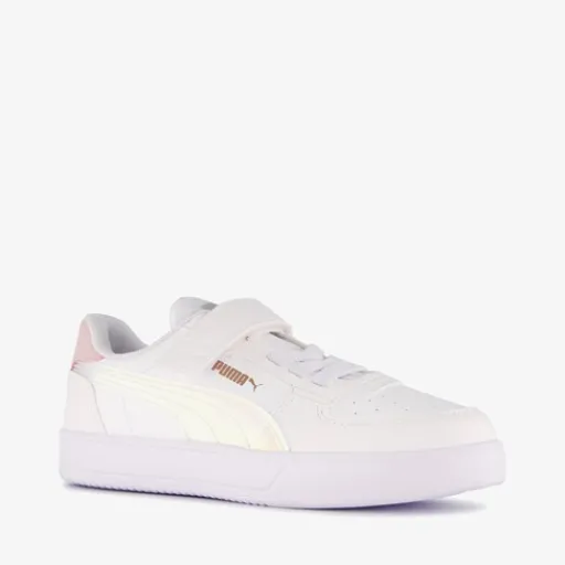 Lage, witte Puma Caven Holo 2.0 AC+ PS kinder sneakers. Gemaakt van imitatieleer, een binnenwerk van textiel en een rubberen zool. De sneakers hebben elastische veters met klittenbandsluiting en een comfortabel SoftFoam+ voetbed die demping biedt. Voorzien van een holografische Formstrip op de zijkanten.