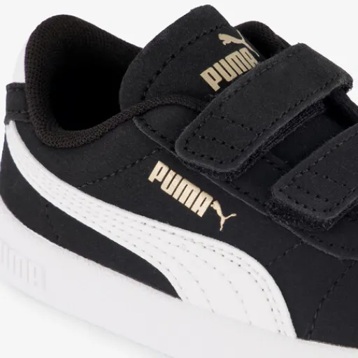 Zwarte Puma Club II V INF sneakers voor kinderen. Het buitenwerk is gemaakt van imitatieleer, het binnenwerk van textiel en de profielzool is van rubber, Voorzien van twee klittenbandsluitingen voor een comfortabele binnenzool van textiel. Deze is niet uitneembaar. De sneakers hebben een contrasterende witte buitenzool, witte Puma Formstrips op de zijpanden en goudkleurige merkopdrukken.