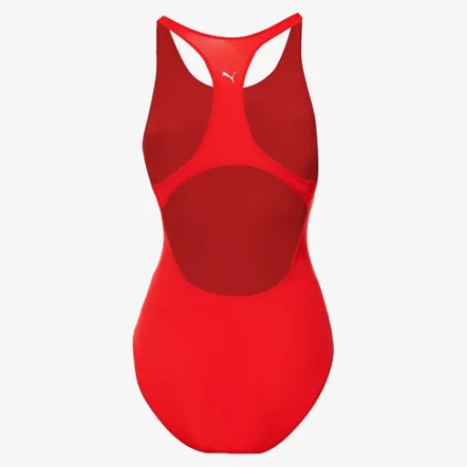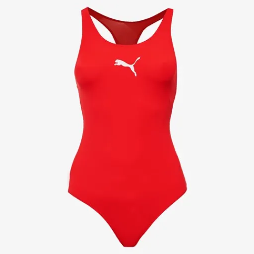 Rood dames badpak van Puma. Dit badpak heeft een racerback wat zorgt voor een sportieve look en het biedt tevens flexibiliteit tijdens het zwemmen. Gemaakt van 78% polyester en 22% elastaan. Het badpak is voorzien van een wit Puma merklogo op de borst. Het badpak is zonnebrandcreme- en oliebestendig en voorzien van 50+ uv-bescherming.