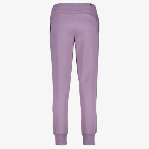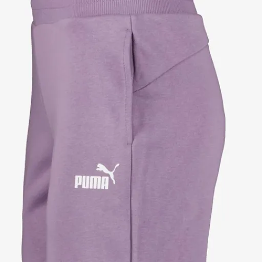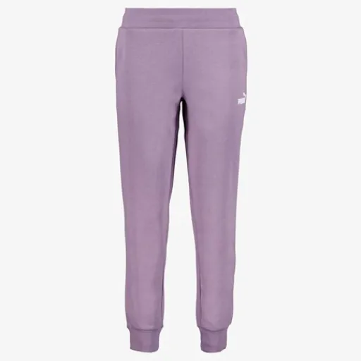 Paarse Puma Essentials joggingbroek voor dames. Voorzien van een elastische tailleband, twee steekzakken aan de voorzijde en een witte merkopdruk op de heup. De broek heeft elastiek in de boorden en is gemaakt van 66% katoen en 34% polyester.
